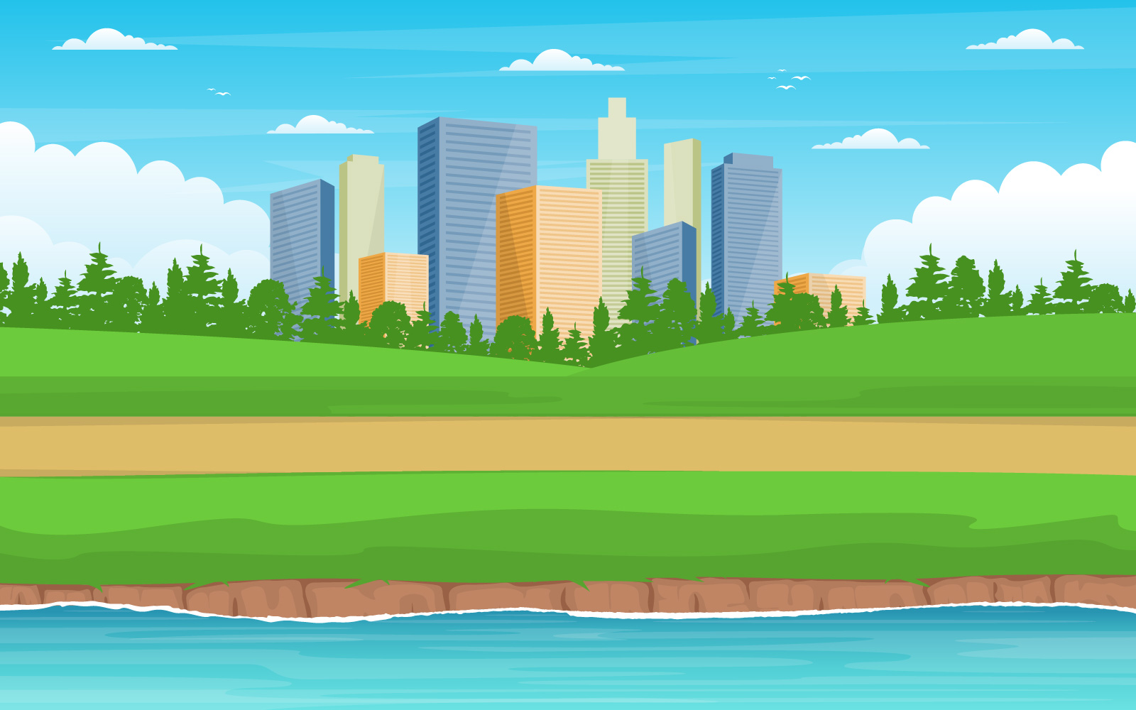 Download Иллюстрация "River City Park - Illustration" / River City Park - Illustration - Иллюстрация на тему графика beautiful,river,city,park,modern,building,skyline,landmark,illustration,vector,water,cloud,town,landscape,lake,urban,flat,cityscape,future,green