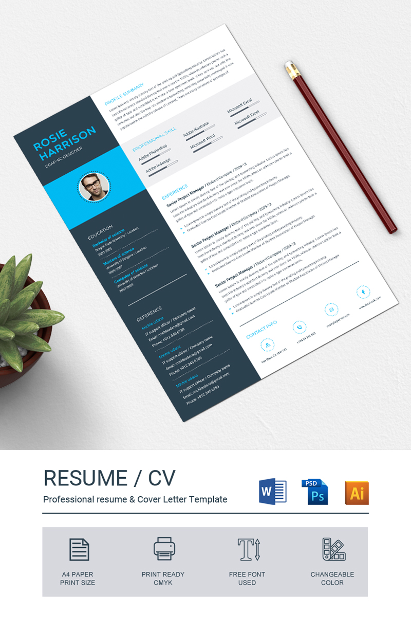Download Резюме "Rosie Resume Template" / Rosie Resume Template - Адаптивный Резюме на тему графика resume template cv clean modern a4 doc elegant indesign infographic professional creative design minimal pages portfolio word us letter
