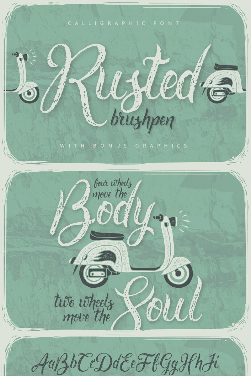 Download Шрифт "Rusted Brushpen Script + Bonus Font" / Rusted Brushpen Script + Bonus Font - Шрифт на тему графика font,type,script,rust,bike,scooter,brushpen,handwritten,handcrafted,dirty,grunge,abc,typeface,letter,text,calligraphy,texture,illustration,graphics