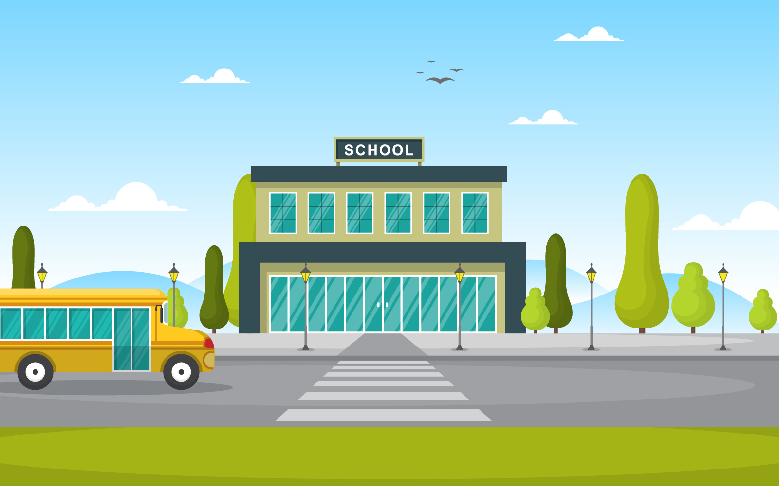 Download Иллюстрация "School Building with Bus - Illustration" / School Building with Bus - Illustration - Иллюстрация на тему графика school,education,building,bus,outdoor,landscape,cartoon,illustration,vector,high,college,exterior,middle,flat,entrance,front,house,study,art,city