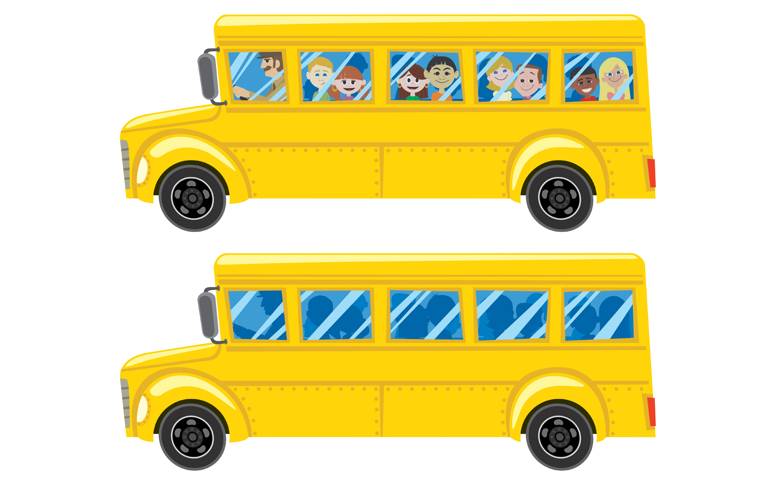 Download Иллюстрация "School Bus - Illustration" / School Bus - Illustration - Иллюстрация на тему графика school,yellow,bus,child,student,boy,girl,silhouette,passenger,driver,education,transportation,travel,trip,field trip,isolated,white,background,vector,cartoon
