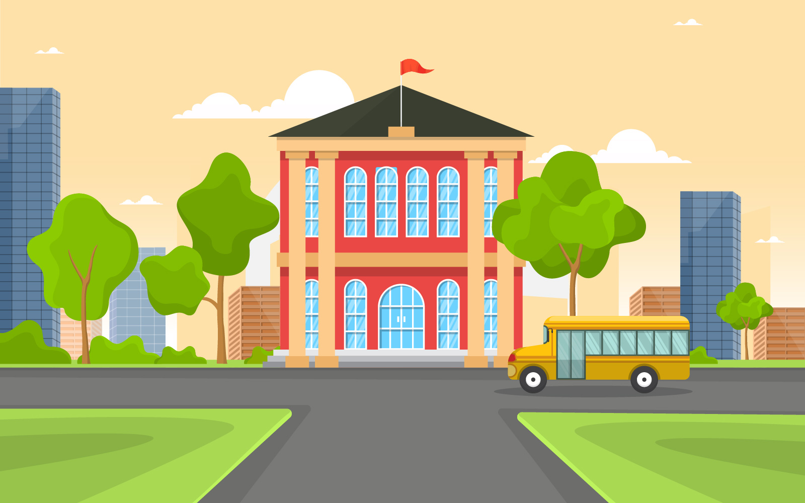 Download Иллюстрация "School Education Building - Illustration" / School Education Building - Illustration - Иллюстрация на тему графика school,education,building,bus,outdoor,landscape,cartoon,illustration,vector,high,college,exterior,middle,flat,entrance,front,house,study,art,city