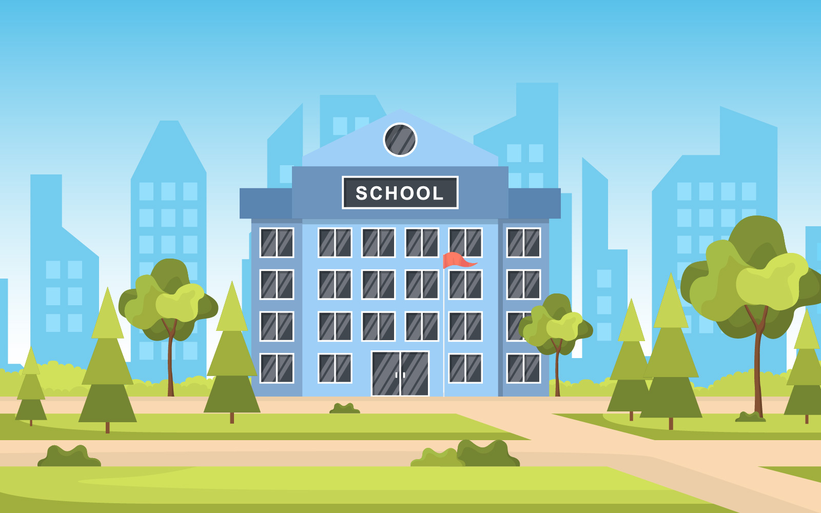 Download Иллюстрация "School Park Landscape - Illustration" / School Park Landscape - Illustration - Иллюстрация на тему графика school,education,building,park,outdoor,landscape,cartoon,illustration,vector,high,exterior,flat,entrance,front,study,art,city,grass,view,library