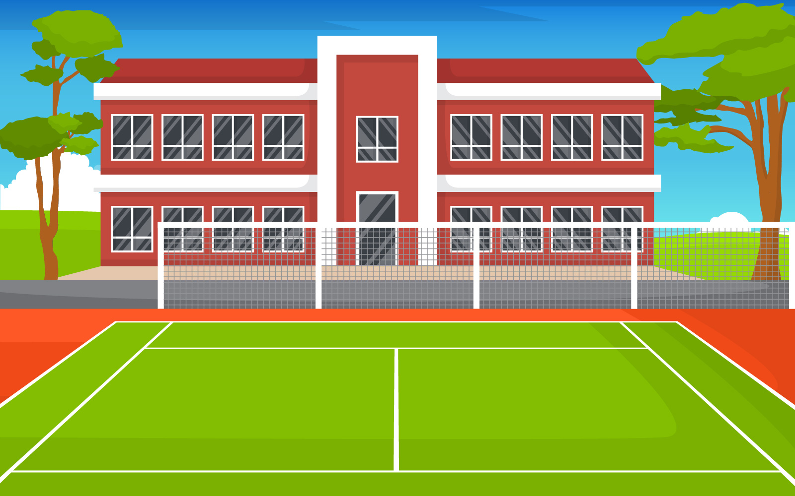 Download Иллюстрация "School Tennis Court - Illustration" / School Tennis Court - Illustration - Иллюстрация на тему графика outdoor,tennis,court,sport,game,recreation,cartoon,school,hotel,landscape,vector,illustration,yard,strength,competition,outdoors,strong,exercise,practicing,cloud