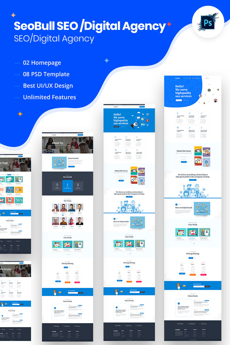 Download PSD шаблон "SeoBull SEO /Digital Agency Website PSD Template" / SeoBull SEO /Digital Agency Website PSD Template - Адаптивный PSD шаблон на тему компания по разработке по agency business clean corporate creative digital flat marketing minimal modern multipurpose portfolio seo start-up psd