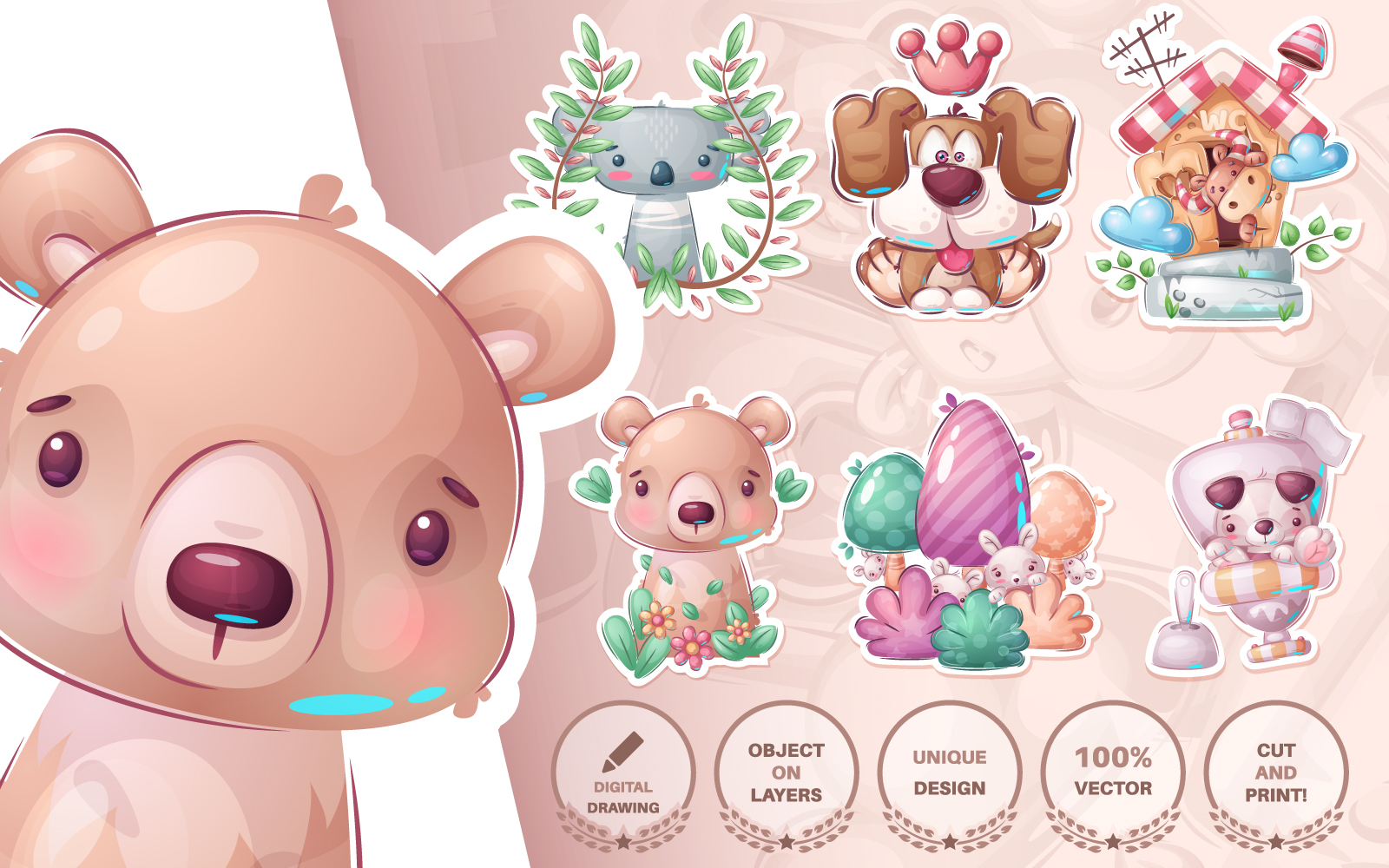Download Иллюстрация "Set Cute Sticker - Seamless Pattern - Illustration" / Set Cute Sticker - Seamless Pattern - Illustration - Иллюстрация на тему графика koala,dog,puppy,cow,ox,bull,bear,forest,rabbit,bunny seamless,pattern,cartoon,character,illustration,picture,smile,emotion,draw,pet,wild
