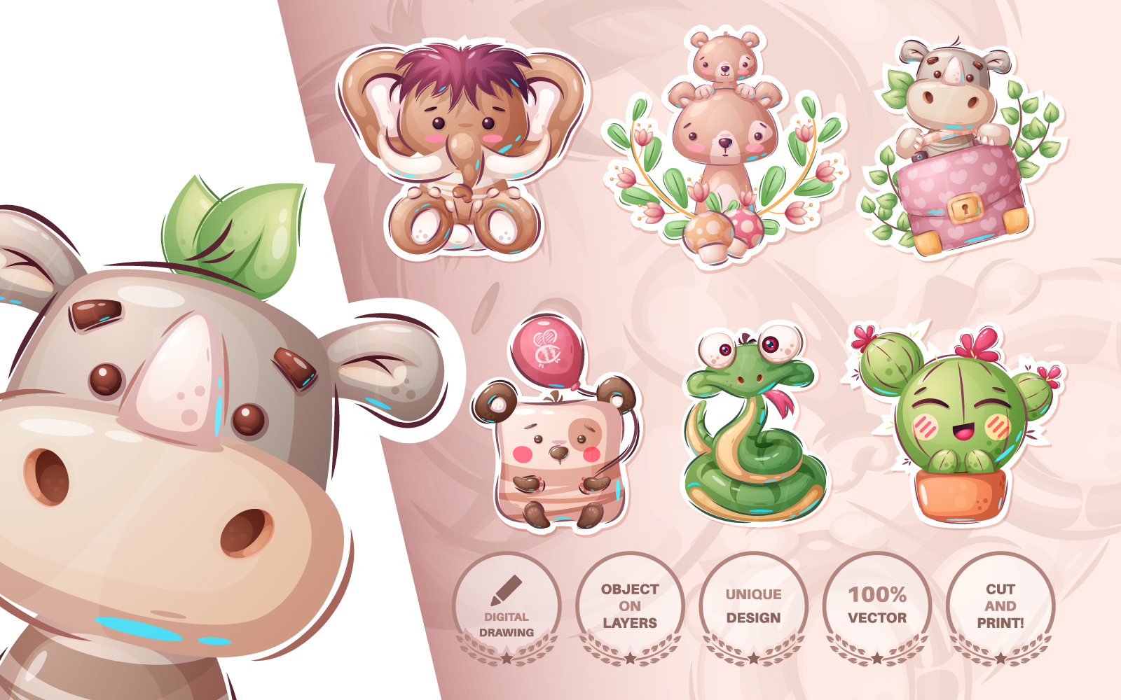 Download Иллюстрация "Set Cute Sticker - Seamless Pattern - Illustration" / Set Cute Sticker - Seamless Pattern - Illustration - Иллюстрация на тему графика mammoth,bear,leaf,flower,rhino,diplomat,snake,cactus,seamless,pattern,cartoon,character,characters,wild,animal,animals,pet,toy,cute,pretty