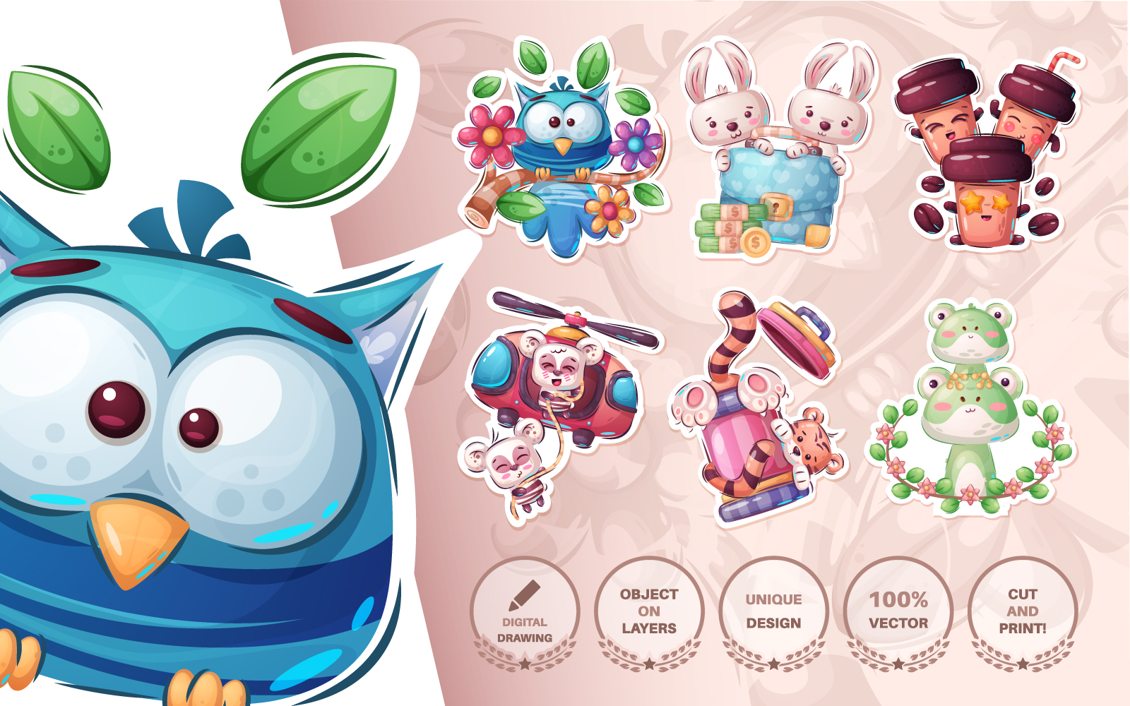 Download Иллюстрация "Set Cute Sticker - Seamless Pattern - Illustration" / Set Cute Sticker - Seamless Pattern - Illustration - Иллюстрация на тему графика seamless,pattern,cartoon,character,wild,animal,animals,pet,toy,cute,bird,owl,rabbit,diplomat,coffee,cup,helicopter,bear,polar,tiger