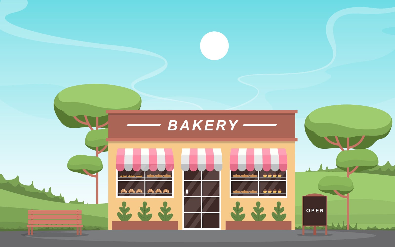 Download Иллюстрация "Showcase Street Bakery - Illustration" / Showcase Street Bakery - Illustration - Иллюстрация на тему графика showcase,bakery,shop,food,store,facade,street,cartoon,illustation,vector,business,exterior,awning,supermarket,architecture,bread,sweet,cafe,cake,dessert