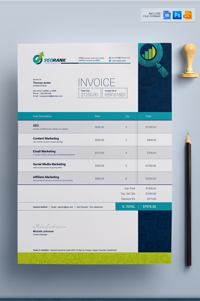 Download Фирменный стиль "Simple Clean MS Word, PSD, EPS Invoice - - Corporate Identity Template" / Simple Clean MS Word, PSD, EPS Invoice - - Corporate Identity Template - Адаптивный Фирменный стиль на тему графика seo digital marketing agency company invoice template design ms word psd eps clean bundle simple modern business cash memo a4