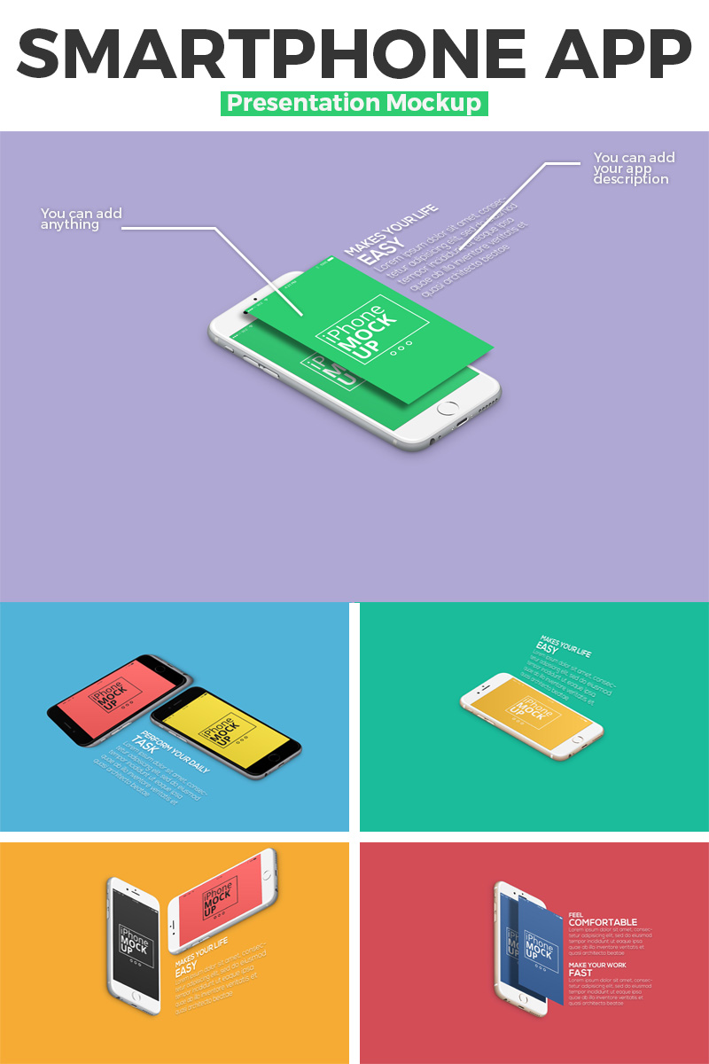 Download Мокап для продукта "Smartphone App product mockup" / Smartphone App product mockup - Мокап для продукта на тему графика isometric smartphone app presentation mock-up professional template psd clean