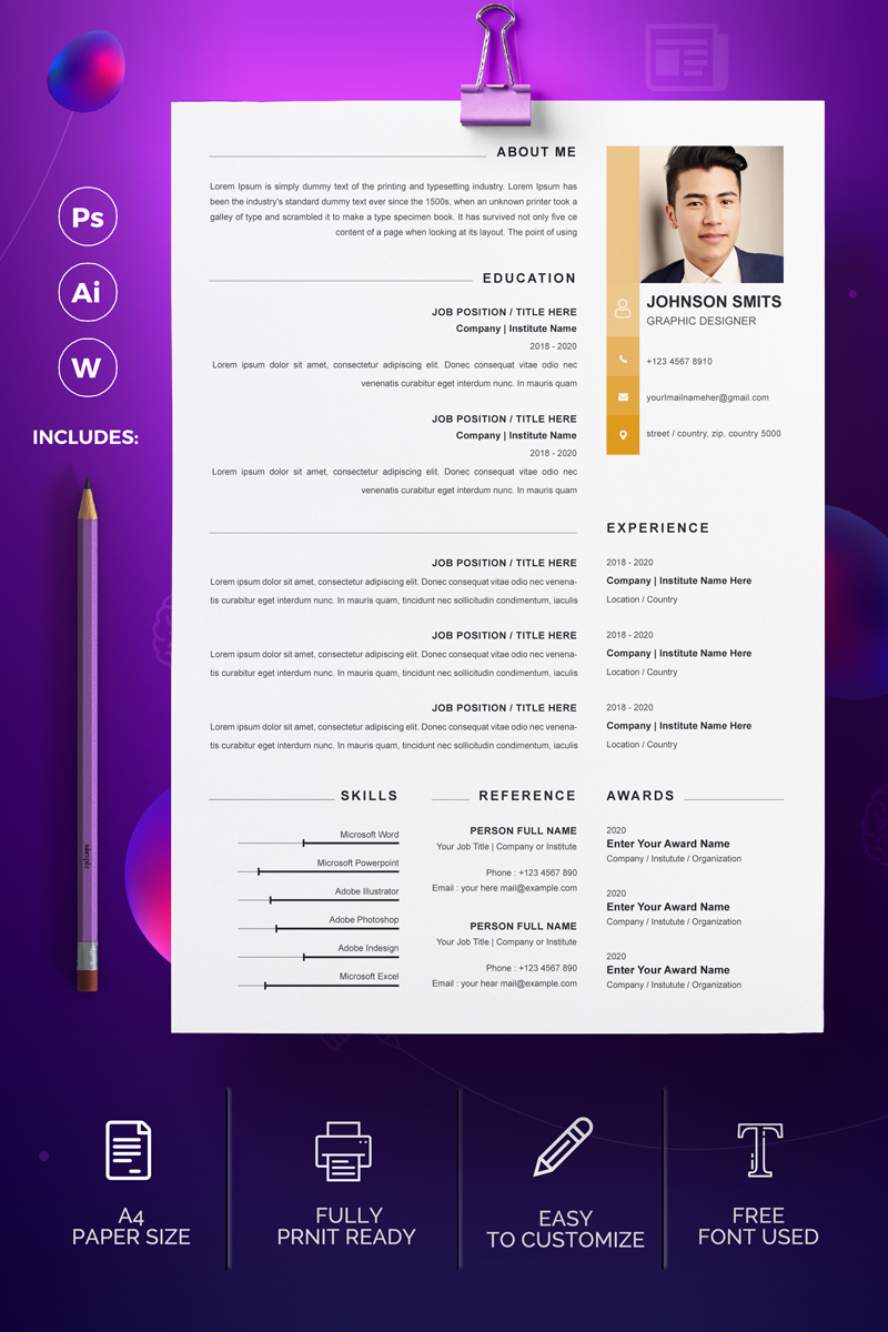 Download Резюме "Smith Resume Template" / Smith Resume Template - Резюме на тему графика a4 clean resume cv doc elegant template indesign infographic modern professional creative design minimal pages portfolio word us letter
