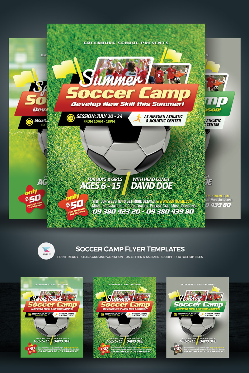 Download Фирменный стиль "Soccer Camp Flyers - Corporate Identity Template" / Soccer Camp Flyers - Corporate Identity Template - Фирменный стиль на тему графика ad advert break children clinic coaching competition event flyer football game kids leaflet match pamphlet school sport soccer training youth