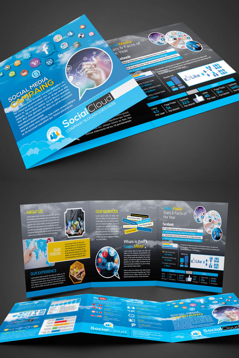 Download Фирменный стиль "Social Media Tri-Fold Brochure - Corporate Identity Template" / Social Media Tri-Fold Brochure - Corporate Identity Template - Фирменный стиль на тему графика social media facebook twitter pinterest youtube video marketing tri-fold brochure brochure design template 3 fold triangle square twi-fold corporate product