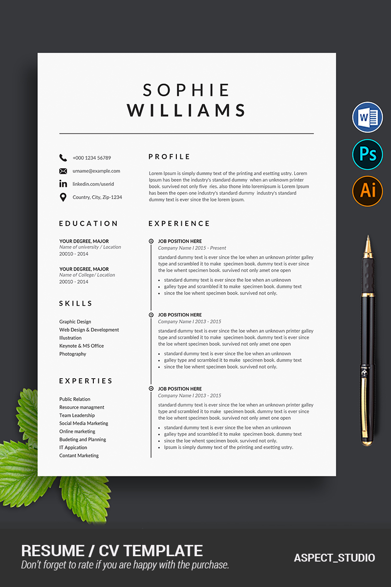 Download Резюме "Sophie Williams Resume Template" / Sophie Williams Resume Template - Резюме на тему графика 1 page resume 2 3 clean cover letter creative cv template design document microsoft word minimalist modern photoshop psd professional