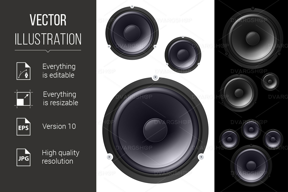 Download Vector "Speakers - Vector Image" / Speakers - Vector Image - Vector на тему графика speakers,illustration,white,black,amplifier,volume,stereo,wallpaper,equipment,circle,wave,technology,woofer,single,funky,isolated,steel,sound,music,element