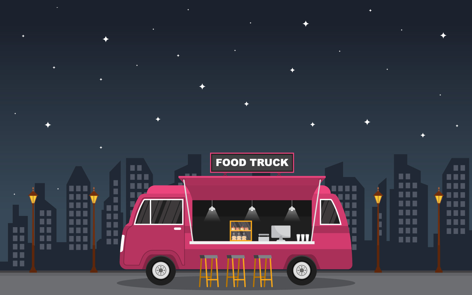 Download Иллюстрация "Street Food Night - Illustration" / Street Food Night - Illustration - Иллюстрация на тему графика food,truck,van,car,street,shop,night,vector,illustration,merchant,delivery,design,service,outdoor,festival,business,park,event,vendor,hipster