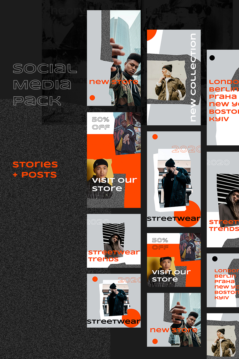 Download Шаблон для соцсетей "Streetwear Instagram Pack Social Media Template" / Streetwear Instagram Pack Social Media Template - Шаблон для соцсетей на тему графика sportswear streetwear style grange dark orange typography instagram stories facebook posts promotion campaign fashion brutal trendy modern texture store ecommerce