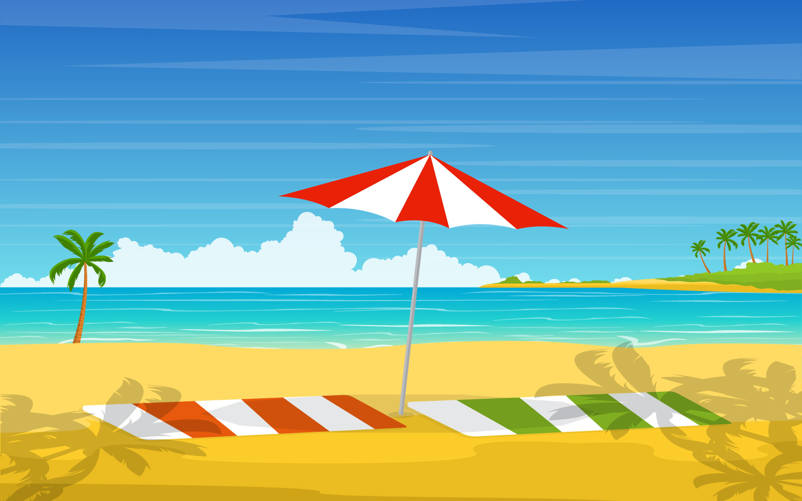 Download Иллюстрация "Summertime Beach Sea - Illustration" / Summertime Beach Sea - Illustration - Иллюстрация на тему графика vacation,tropical,beach,sea,palm,tree,summer,landscape,vector,illustration,background,sky,island,blue,panorama,shore,cartoon,sand,seaside,holiday