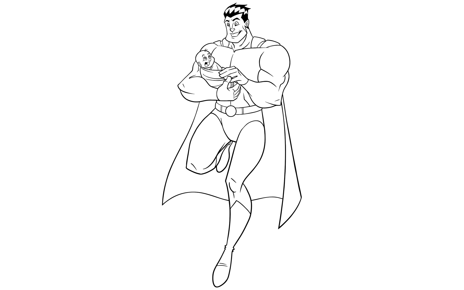 Download Иллюстрация "Super Dad with Baby Line Art - Illustration" / Super Dad with Baby Line Art - Illustration - Иллюстрация на тему графика man,hero,cape,super,father,baby,superhero,dad,daddy,cartoon,holding,care,happy,smiling,son,cute,child,newborn,safe,safety