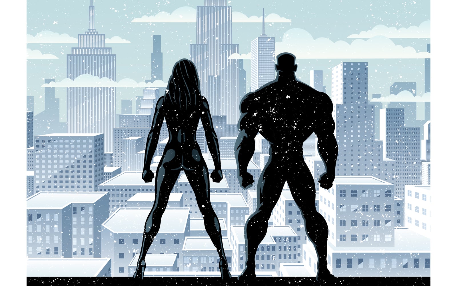 Download Иллюстрация "Superhero Couple Watch Winter 2 - Illustration" / Superhero Couple Watch Winter 2 - Illustration - Иллюстрация на тему графика superhero,couple,family,team,silhouette,superman,superheroine,super,hero,man,male,female,heroine,woman,girl,superwoman,watch,watching,over,city