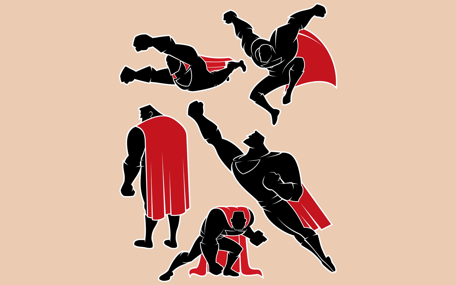 Download Иллюстрация "Superhero in Action 2 - Illustration" / Superhero in Action 2 - Illustration - Иллюстрация на тему графика superhero,super,hero,man,superman,silhouette,power,comic book,symbol,mascot,set,pack,action,figure,standing,flying,pose,posing,running,crouching