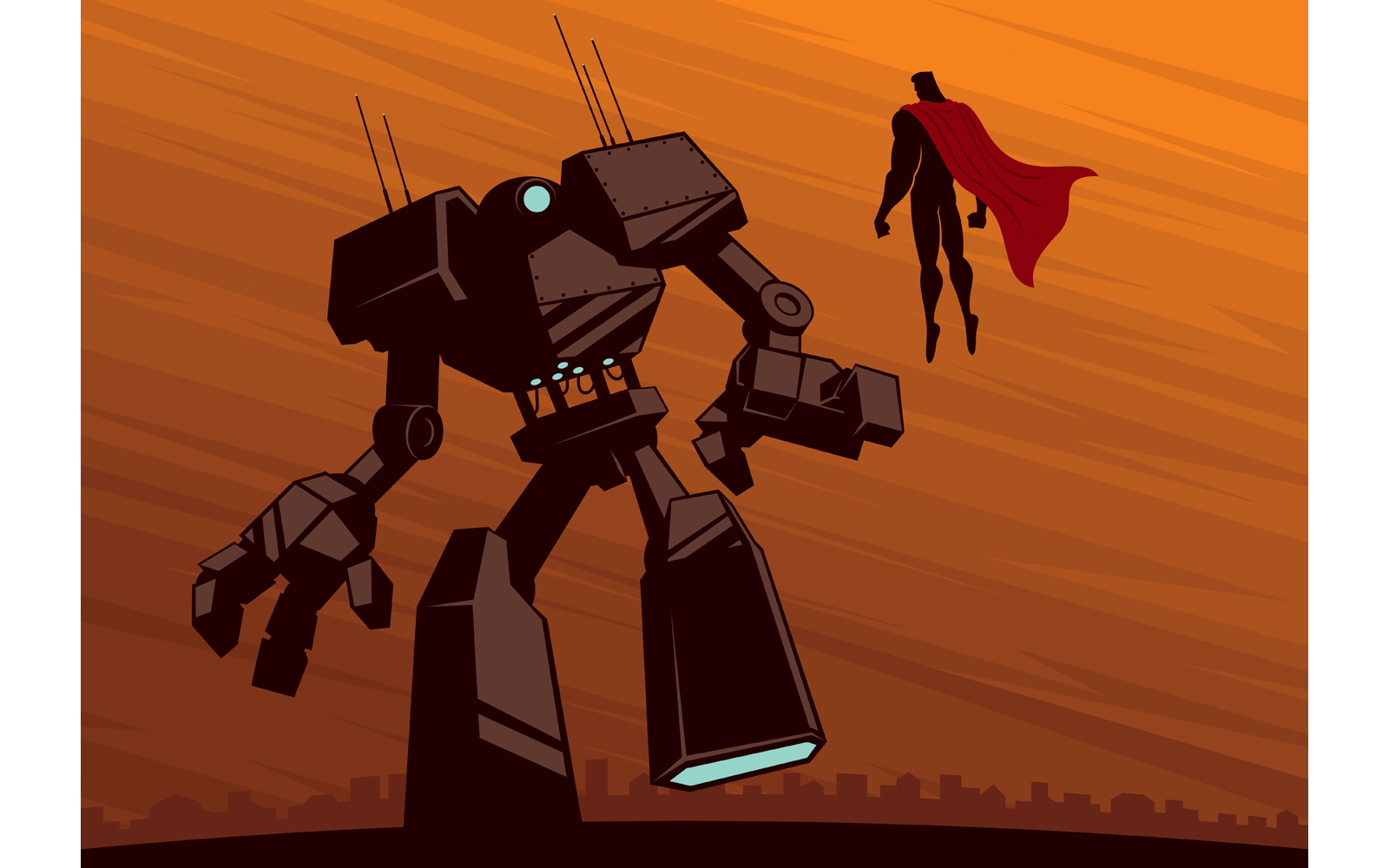 Download Иллюстрация "Superhero versus Robot 2 - Illustration" / Superhero versus Robot 2 - Illustration - Иллюстрация на тему графика superhero,super,hero,man,superman,robot,supervillain,villain,silhouette,evil,good,battle,facing,confrontation,versus,vs,concept,justice,savior,defender