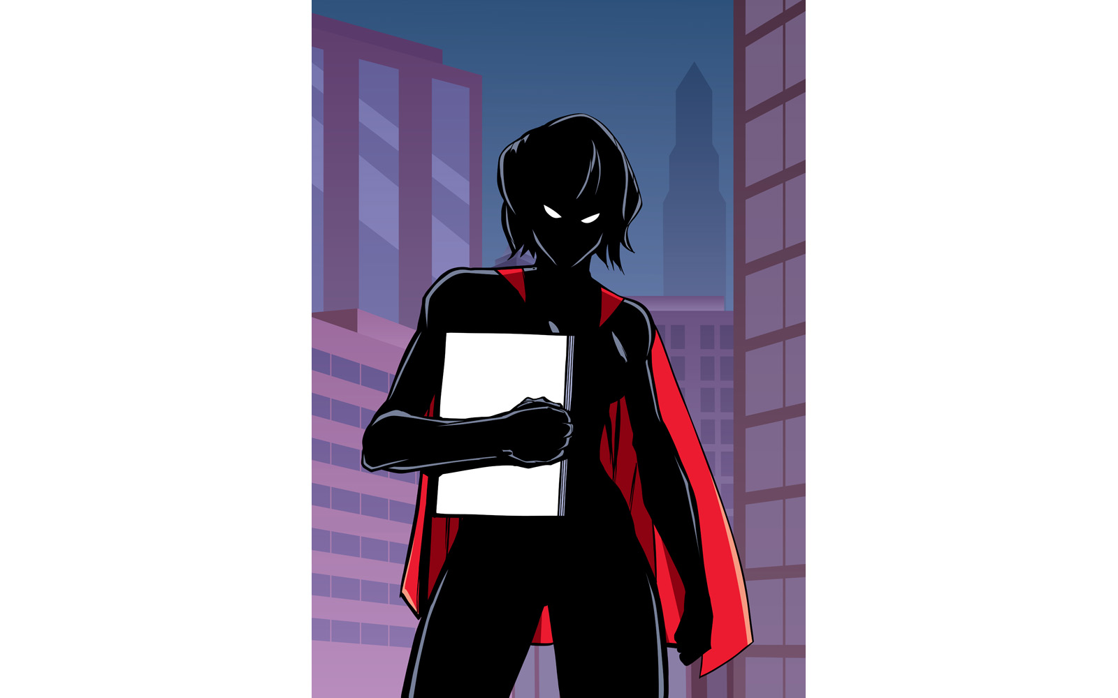 Download Иллюстрация "Superheroine Holding Book in City Vertical Silhouette - Illustration" / Superheroine Holding Book in City Vertical Silhouette - Illustration - Иллюстрация на тему графика woman,hero,superhero,super,heroine,superheroine,female,girl,silhouette,character,comic,comic strip,book,holding,carrying,bringing,propaganda,poster,copy space,city