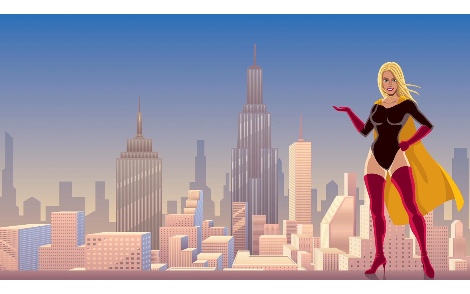 Download Иллюстрация "Superheroine Presenting in City - Illustration" / Superheroine Presenting in City - Illustration - Иллюстрация на тему графика superhero,female,superheroine,super,hero,heroine,woman,girl,power,superwoman,presenting,showing,pointing,presentation,invitation,advertisement,promotion,city,cityscape,skyline