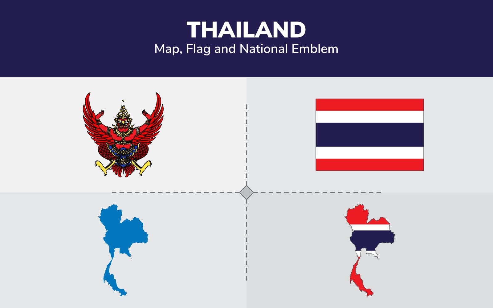 Download Иллюстрация "Thailand Map, Flag and National Emblem - Illustration" / Thailand Map, Flag and National Emblem - Illustration - Иллюстрация на тему графика continents,countries,map,political map,traveling,vector,emblem,national,flag,coat,arms,country,symbol,nations,state,sign,nation,badge,symbolic object,europe