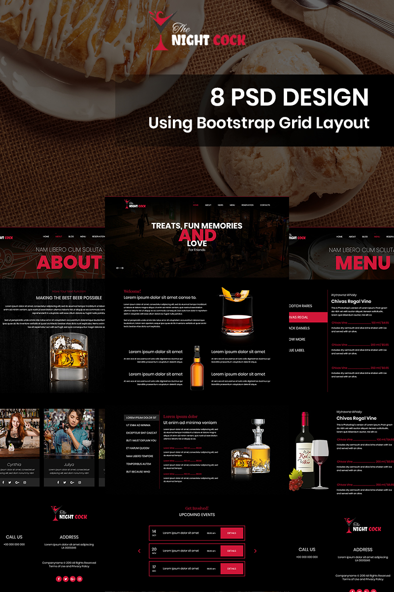 Download PSD шаблон "The Night Cock - Cocktail Bar PSD Template" / The Night Cock - Cocktail Bar PSD Template - PSD шаблон на тему коктейль-бар cocktail bar template theme psd photoshop food drinks mocktail