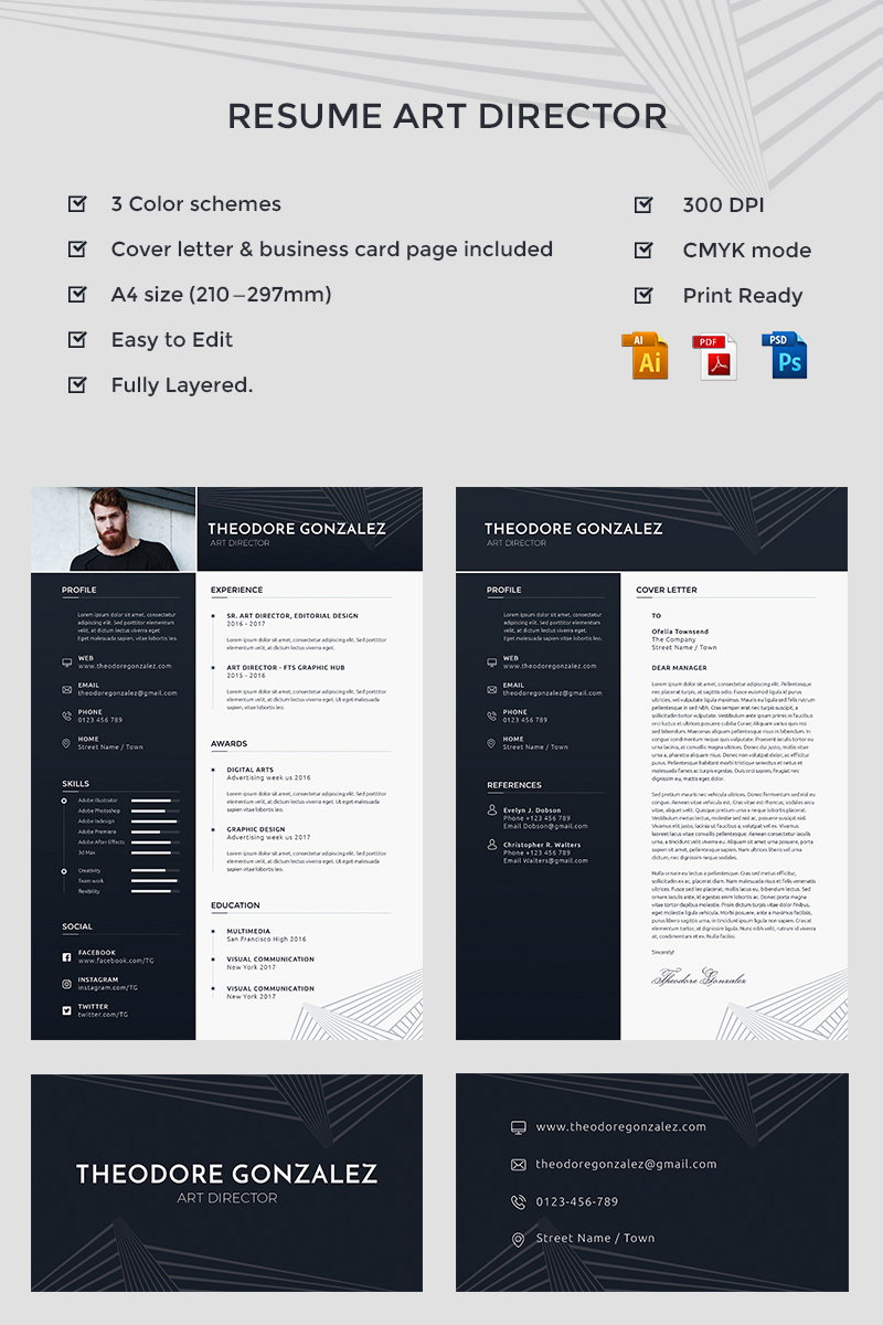 Download Резюме "Theodore Gonzalez - Art Director Resume Template" / Theodore Gonzalez - Art Director Resume Template - Резюме на тему графика resume art cv business card cover letter vector free-fonts ai bonus a4 customizable printable print-ready 300 dpi professional cmyk psd