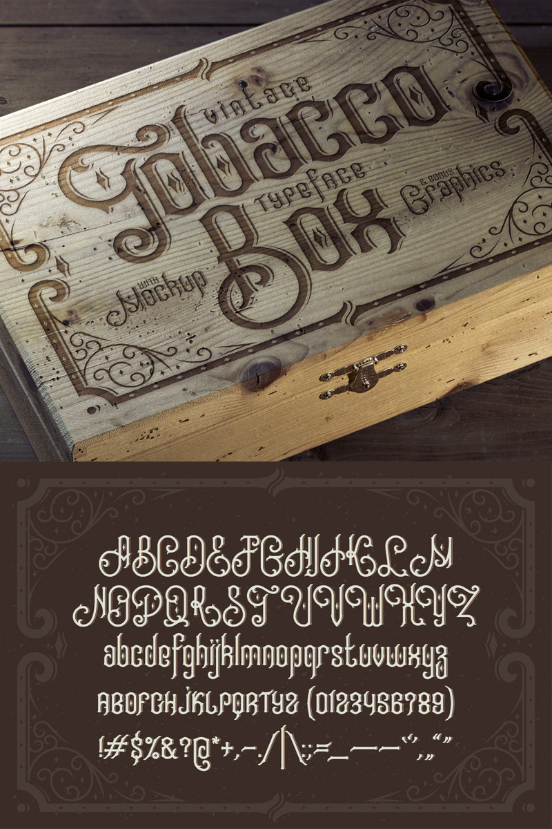 Download Шрифт "Tobacco Box Font" / Tobacco Box Font - Шрифт на тему графика abc,alphabet,art,awesome,box,cigar,circle,cool,decoration,decorative,design,fine,font,frame,gothic,graphic,handcrafted,illustration,label,logo