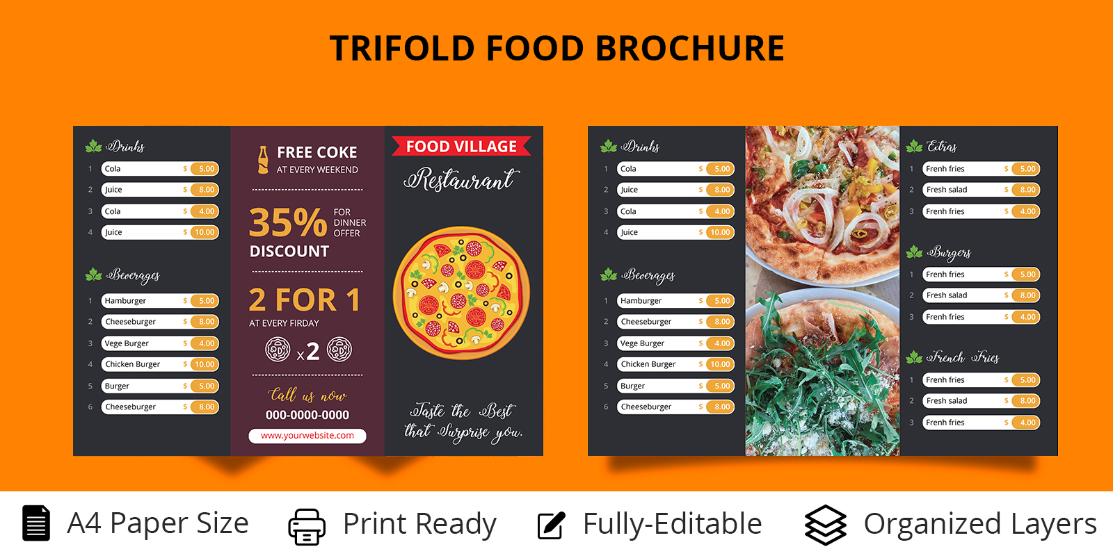 Download Фирменный стиль "Trifold Food Menu Brochure, Flyer PSD, AI - Corporate Identity Template" / Trifold Food Menu Brochure, Flyer PSD, AI - Corporate Identity Template - Фирменный стиль на тему графика snack,three,cartoon,tri,delicious,fold,handout,fresh,leaflet,trifold,poster,graphic,meal,typography,shake,cook,chef,dinner,flyer,a4