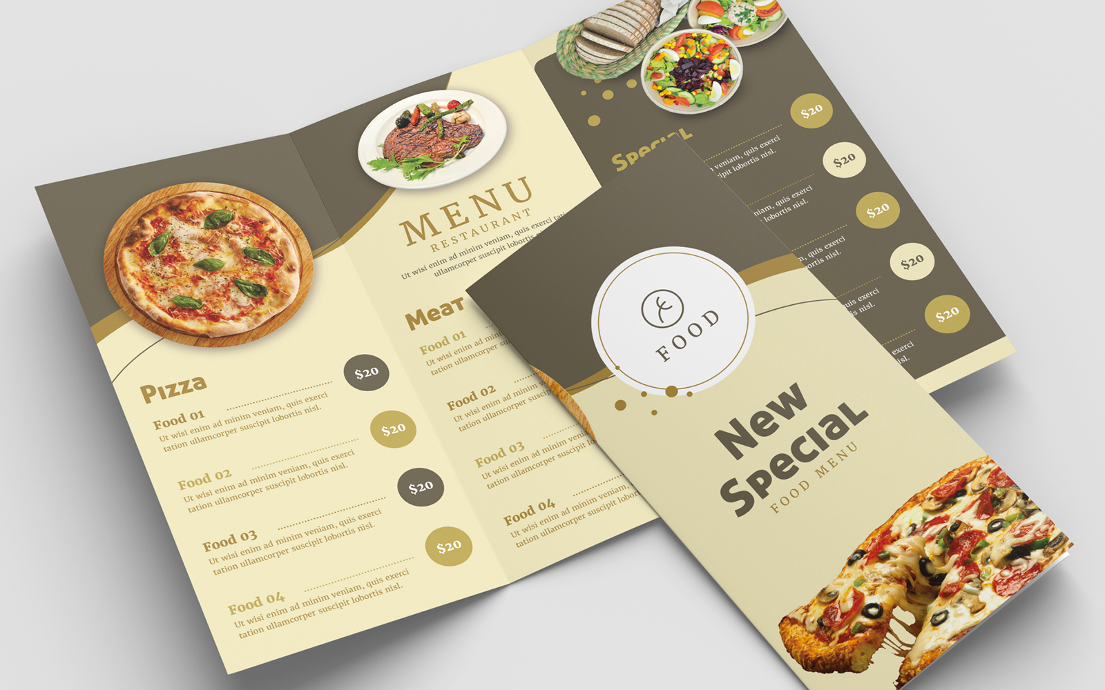 Download Фирменный стиль "Trifold Menu Creative - Corporate Identity Template" / Trifold Menu Creative - Corporate Identity Template - Фирменный стиль на тему графика trifold,menu,pizza,restaurant,food,meal,price,catalog,chef,fast food