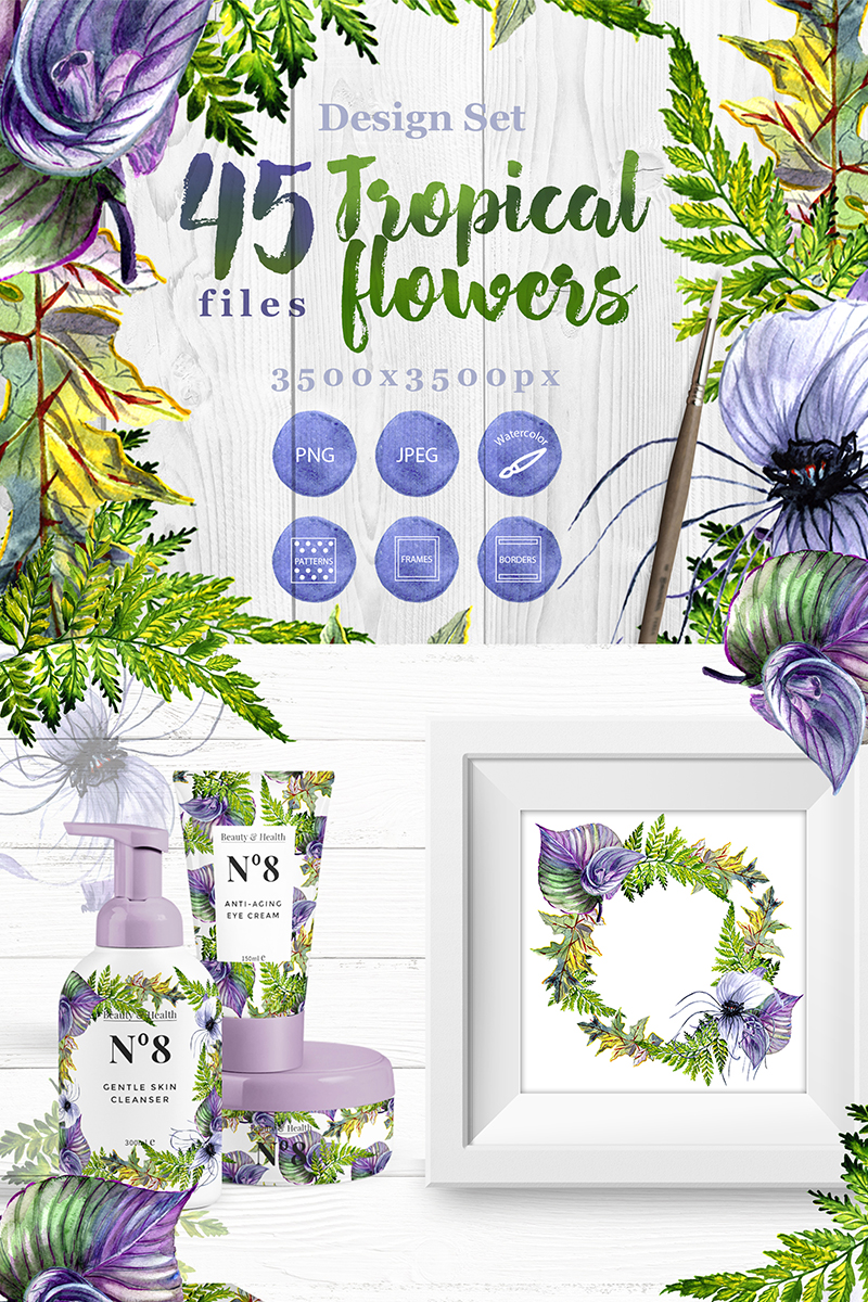 Download Иллюстрация "Tropical Flowers PNG Watercolor Set - Illustration" / Tropical Flowers PNG Watercolor Set - Illustration - Иллюстрация на тему графика watercolor illustration delicate tropical drawing background textile colorful drawn paint leaf plant wildflower seasonal foliage flower tropic sprout stem purple