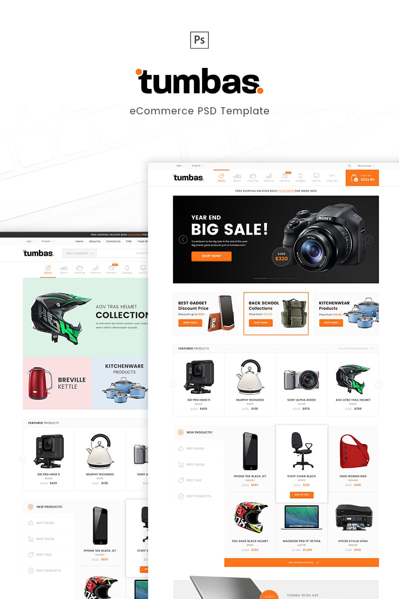 Download PSD шаблон "Tumbas - eCommerce PSD Template" / Tumbas - eCommerce PSD Template - PSD шаблон на тему графика camera clean ecommerce electronic gadget marketplace modern online shop store retail shopping template