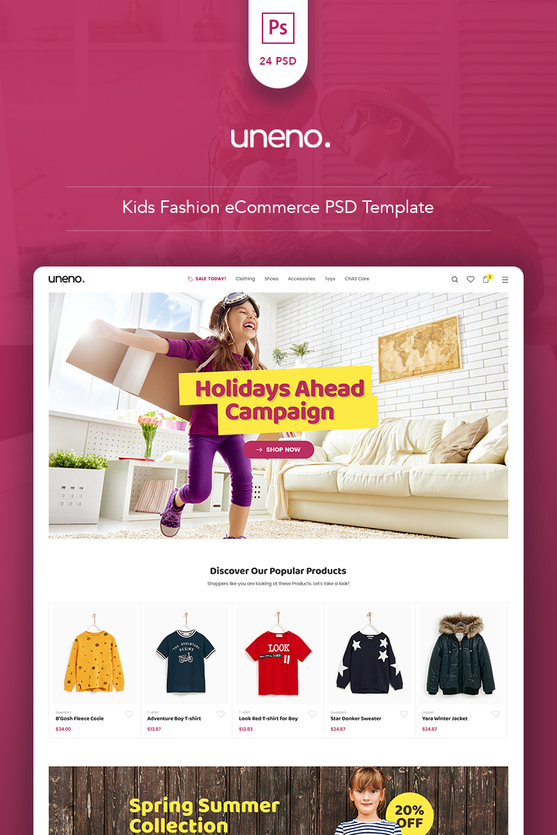 Download PSD шаблон "Uneno - Kids Fashion eCommerce PSD Template" / Uneno - Kids Fashion eCommerce PSD Template - PSD шаблон на тему детская мода boys clothing e-commerce ecommerce fashion fun girl kids psd shop shopping sweater template toys tshirt