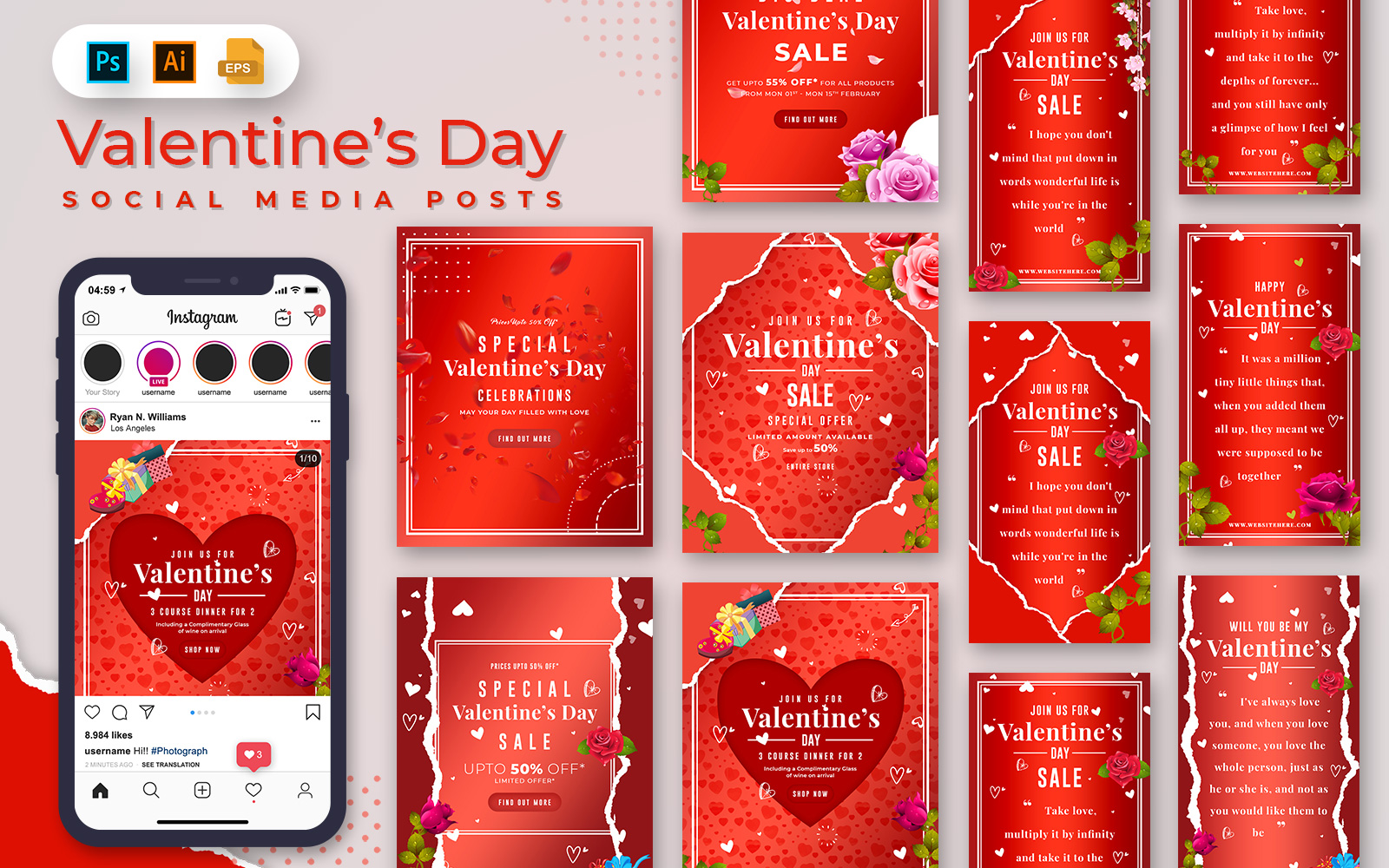Download Шаблон для соцсетей "Valentine Day Posts Social Media Template" / Valentine Day Posts Social Media Template - Шаблон для соцсетей на тему графика social,media,banners,instagram,posts,stories,socialmedia,feed,story,banner,valentine,day,event,feb14,insta