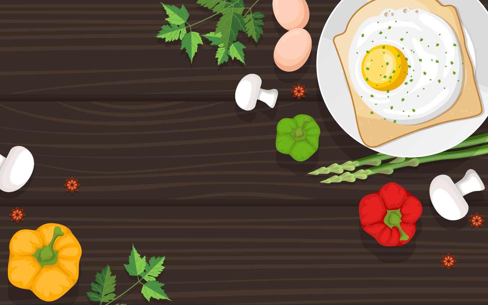 Download Иллюстрация "Vegetables Eggs Bread - Illustration" / Vegetables Eggs Bread - Illustration - Иллюстрация на тему графика eggs,bread,vegetables,cooking,wooden,table,kitchen,backdrop,illustration,vector,plate,star,anise,coriander,leaves,red,green,yellow,paprika,mushroom