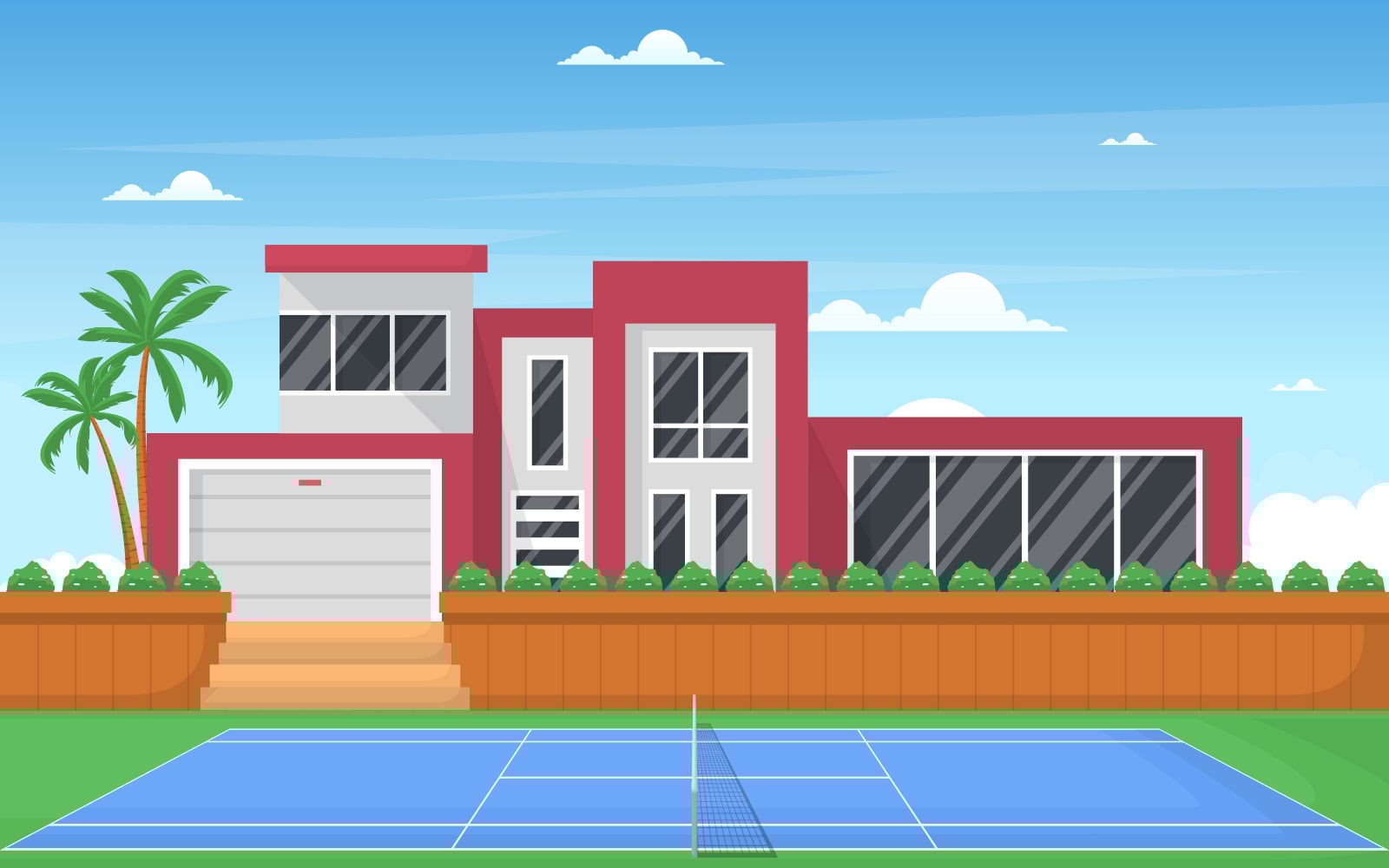 Download Иллюстрация "Villa Tennis Court - Illustration" / Villa Tennis Court - Illustration - Иллюстрация на тему графика outdoor,tennis,court,sport,game,recreation,cartoon,villa,house,landscape,vector,illustration,building,yard,backyard,stairs,bush,challenge,lifestyle,play