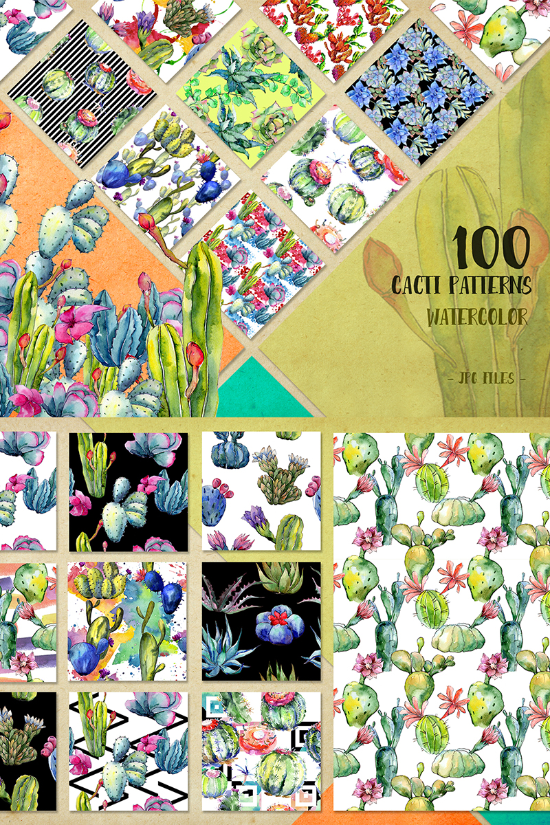 Download Иллюстрация "Watercolor 100 Cacti Patterns JPG Set - Illustration" / Watercolor 100 Cacti Patterns JPG Set - Illustration - Иллюстрация на тему графика watercolor illustration pattern drawing background colorful drawn paint 100 tropical tropic hawaii seamless texture wallpaper fabric ornament print tile cacti