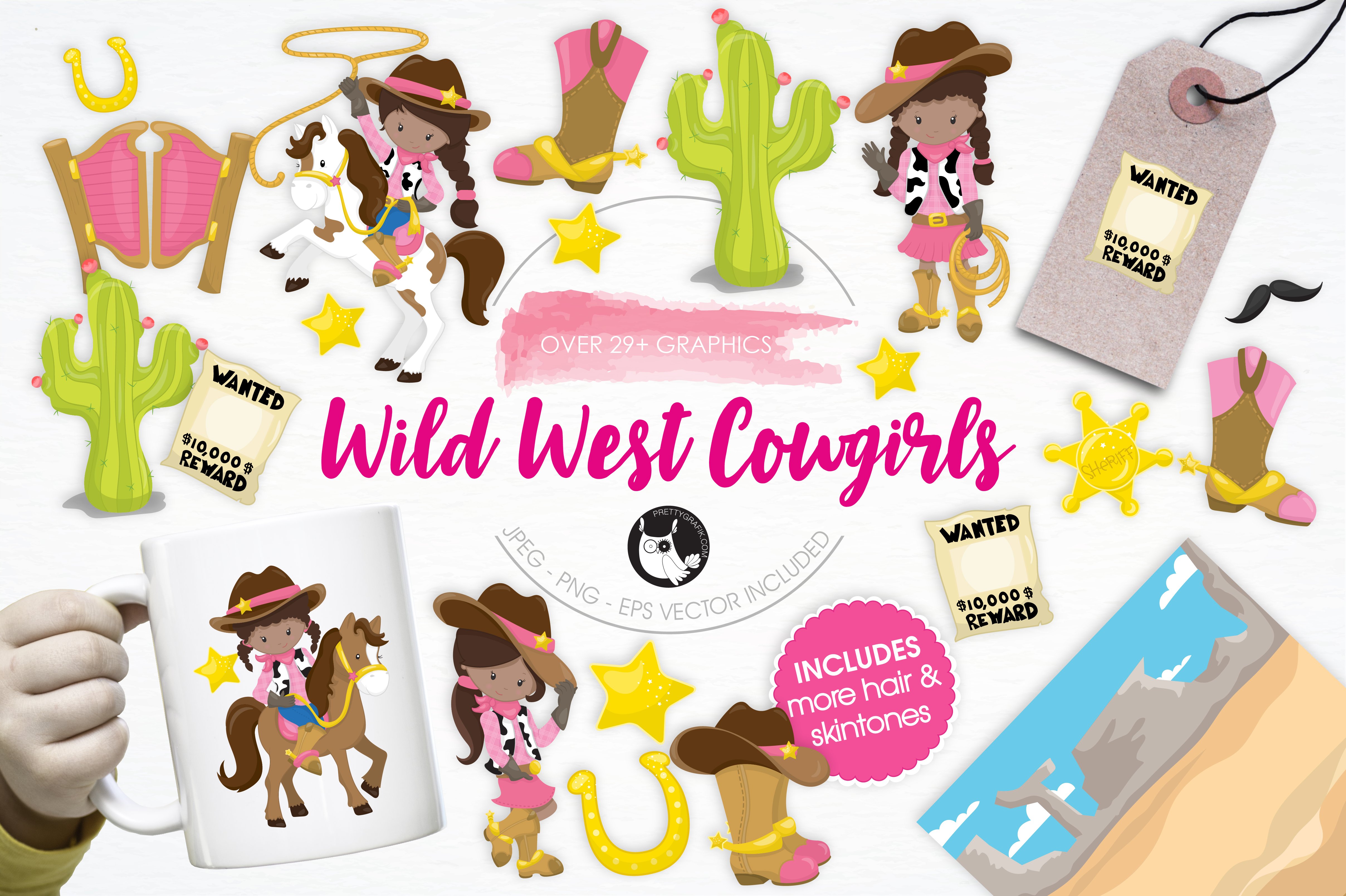 Download Vector "Wild West Cowgirls illustration pack - Vector Image" / Wild West Cowgirls illustration pack - Vector Image - Vector на тему графика illustration,vector,graphics,clipart,cactus,clip art,icon,desert,horse,eps,prettygrafik,girls,wild west cowgirls,cowgirls,wild west