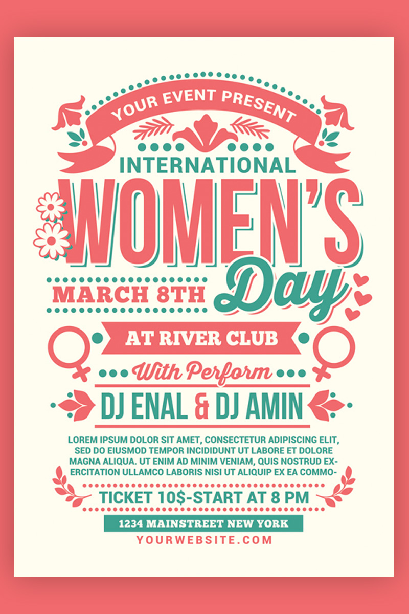 Download Фирменный стиль "Womens Day International Flyer - Corporate Identity Template" / Womens Day International Flyer - Corporate Identity Template - Фирменный стиль на тему графика 8 march flyer advert advertise announcement club day feminine flowers girl international ladies lady leaflet march mothers night party post