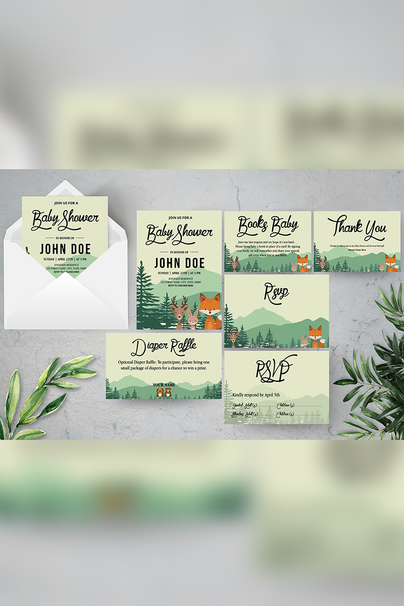 Download Фирменный стиль "Woodland Baby Shower Suite - Corporate Identity Template" / Woodland Baby Shower Suite - Corporate Identity Template - Фирменный стиль на тему графика baby invitation party shower creative docx easy to use editable template layered minimal ms word photoshop printable psd suite woodland