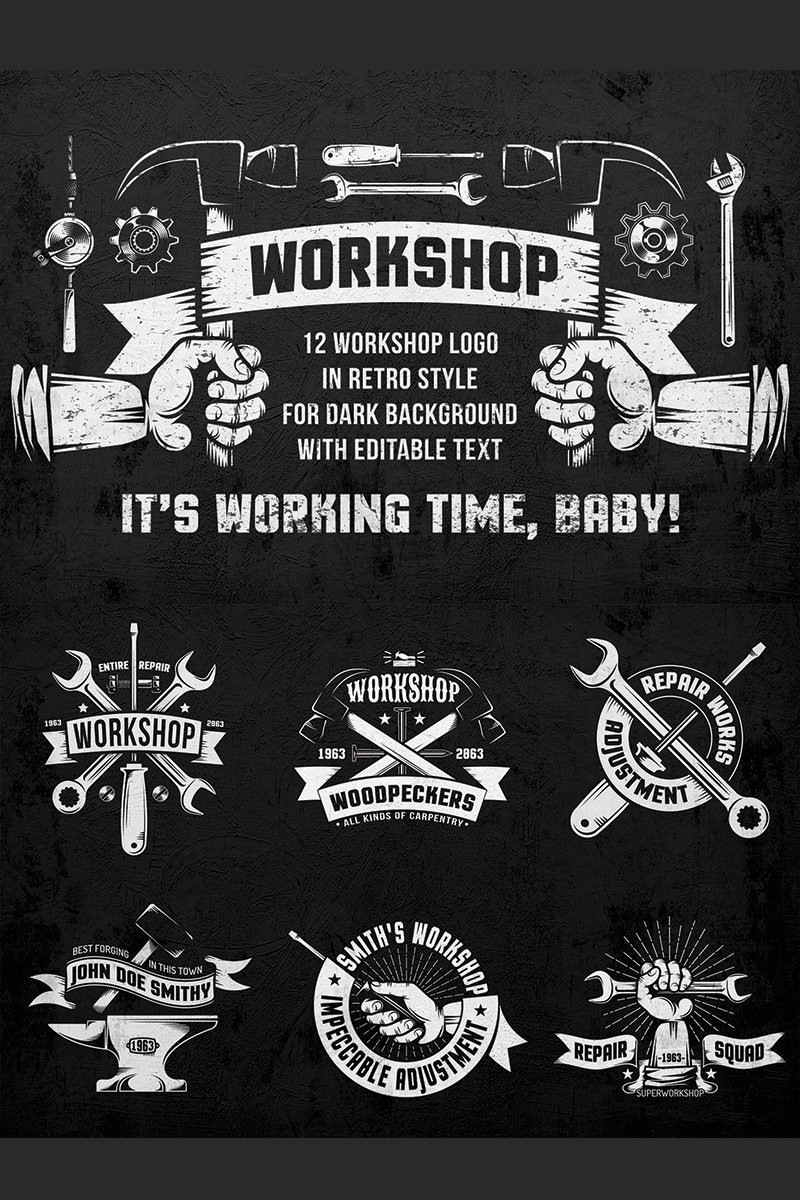 Download Иллюстрация "Workshop Emblems On Dark - Illustration" / Workshop Emblems On Dark - Illustration - Иллюстрация на тему графика emblem badge label illustration banner professional poster stamp ribbon symbol