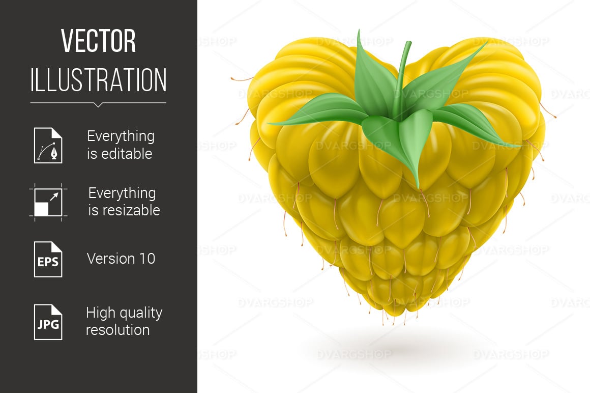 Download Vector "Yellow Raspberry Heart with Green Leaves - Vector Image" / Yellow Raspberry Heart with Green Leaves - Vector Image - Vector на тему графика yellow,heart,raspberry,green,white,kind,affair,sort,freshness,selection,relationship,passionate,romance,color,health,natural,juicy,delicious,passion,amour