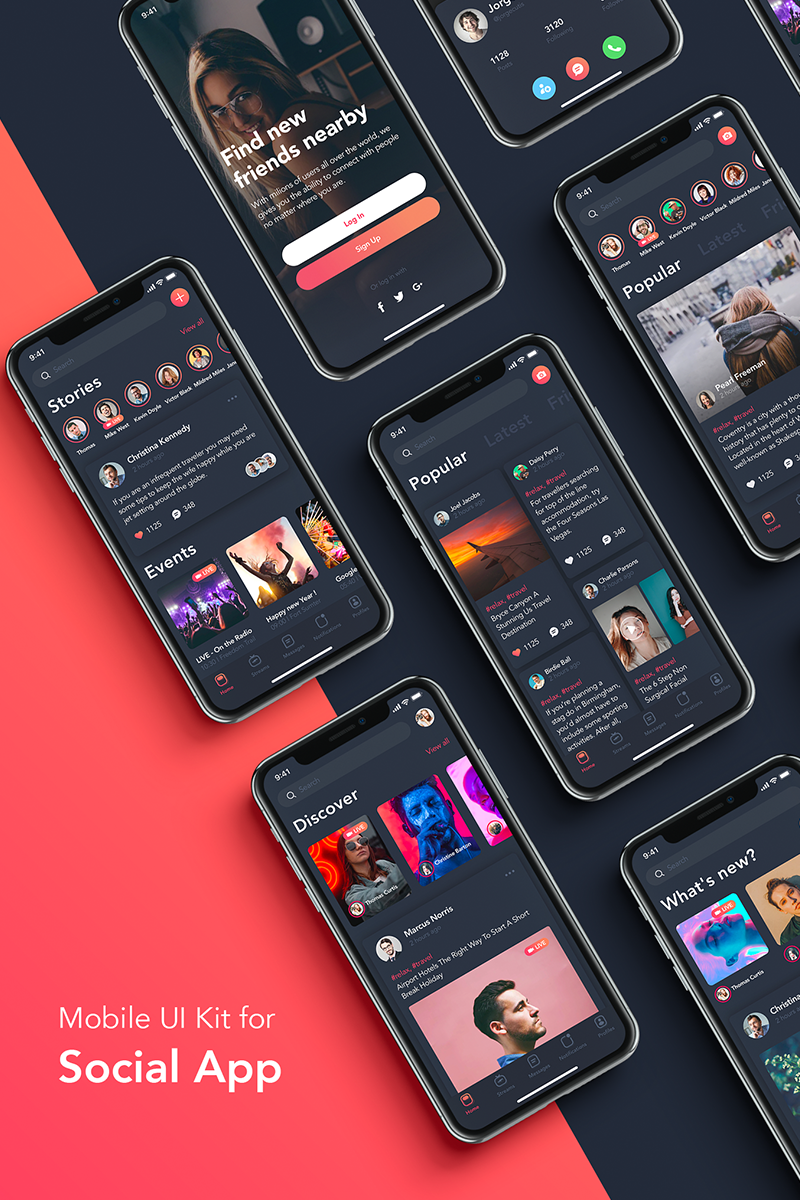 Download UI элементы "Zingo Social App UI Kit " / Zingo Social App UI Kit - UI элементы на тему графика mobile ui kit dating message chat feed stream live app statistics articles interface ios material