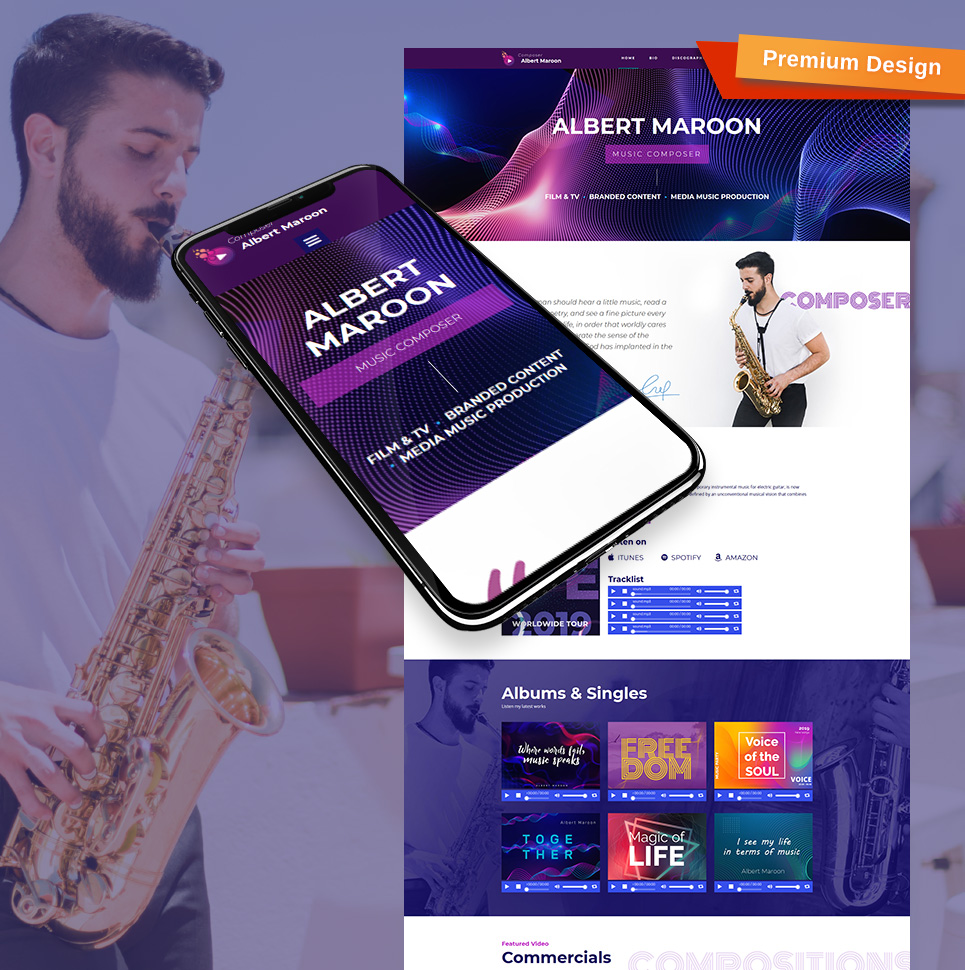 Moto CMS 3 профессиональный шаблон - Albert Maroon - Music Composer Moto CMS 3 Template, подойдет для сайтов Композитор.
