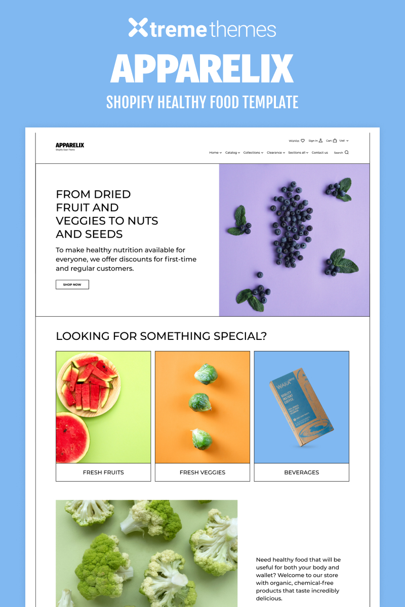 Shopify шаблон интернет-магазина - Grocery Store - Apparelix Healthy Food eCommerce Template Shopify Theme, превосходно подойдет для сайтов в категории Продуктовый магазин.